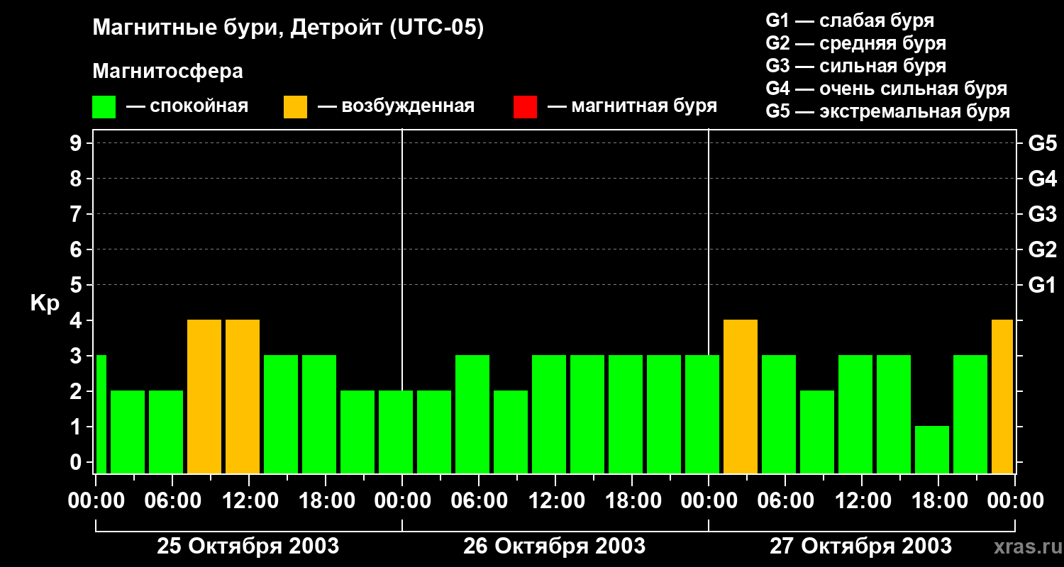 Изменения геомагнитного индекса Kp с 25 по 27 октября 2003 года для средних широт