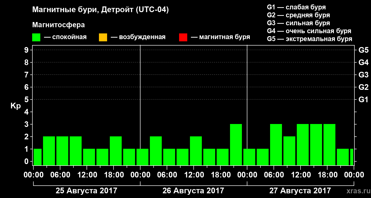 Изменения геомагнитного индекса Kp с 25 по 27 августа 2017 года для средних широт