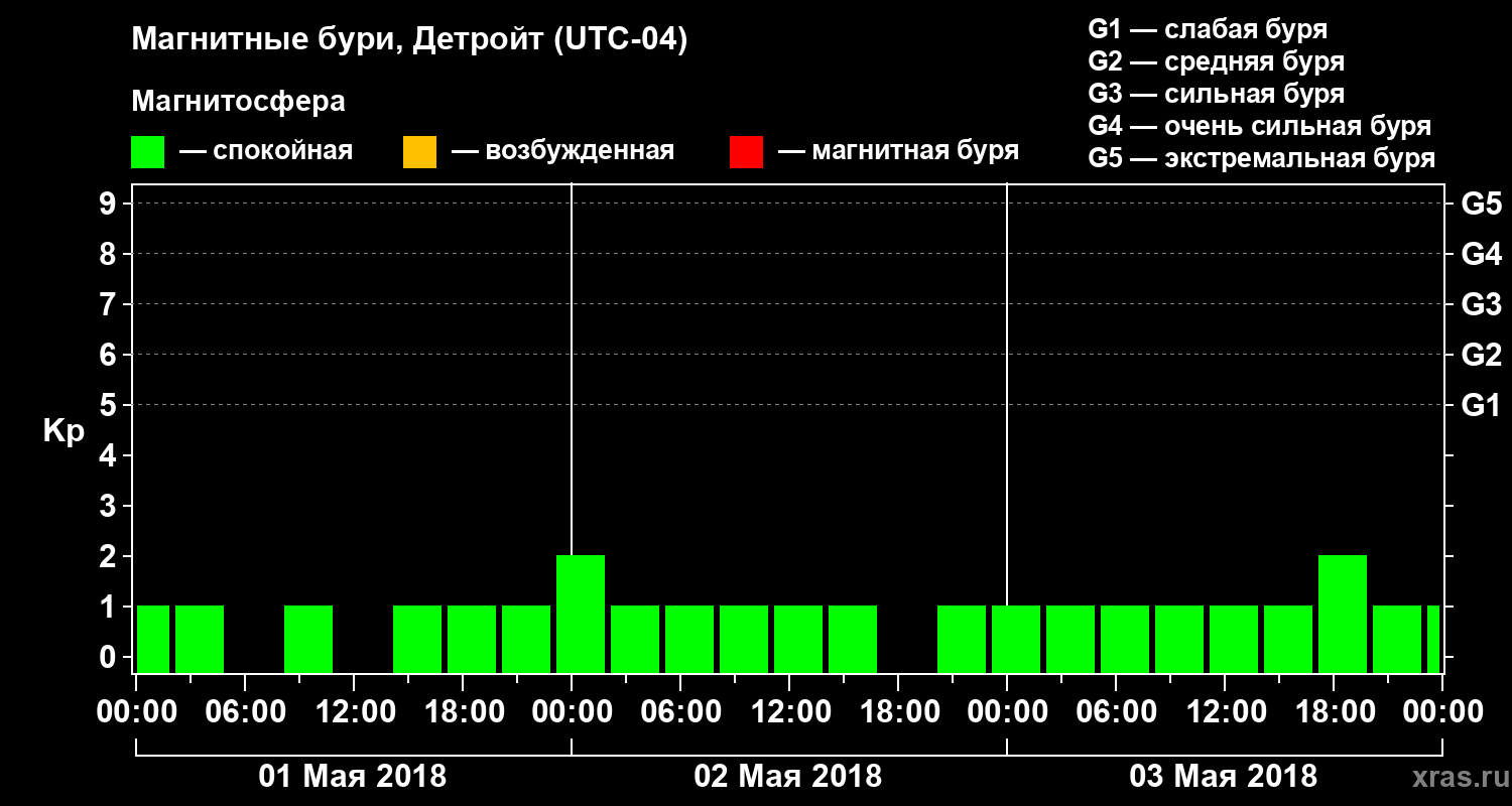 Изменения геомагнитного индекса Kp с 1 по 3 мая 2018 года для средних широт