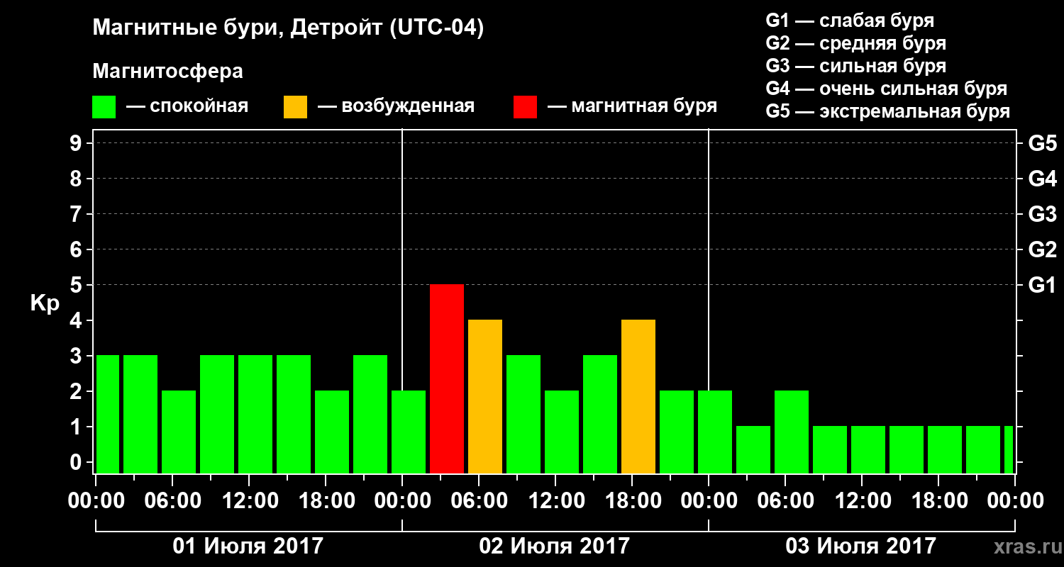Изменения геомагнитного индекса Kp с 1 по 3 июля 2017 года для средних широт
