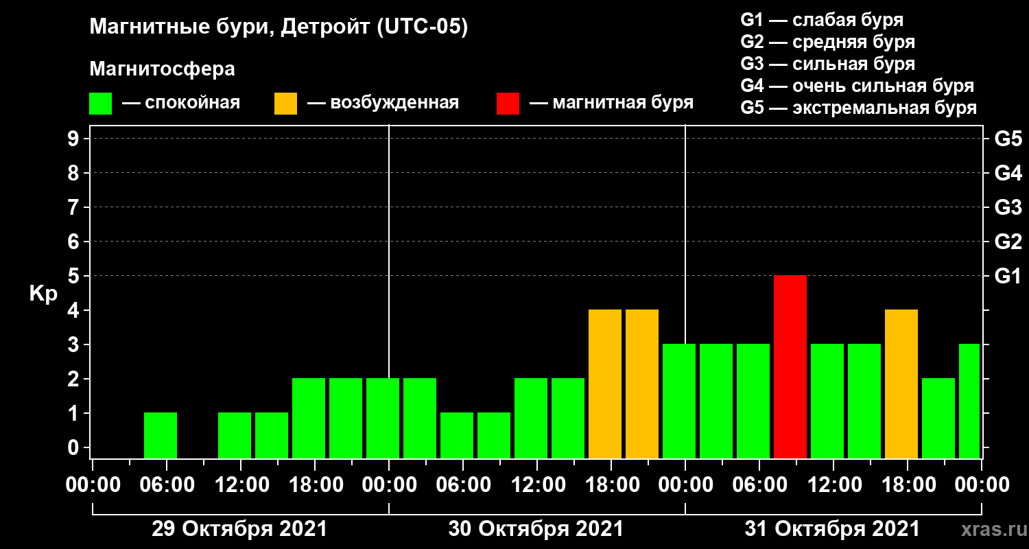 Изменения геомагнитного индекса Kp с 29 по 31 октября 2021 года для средних широт