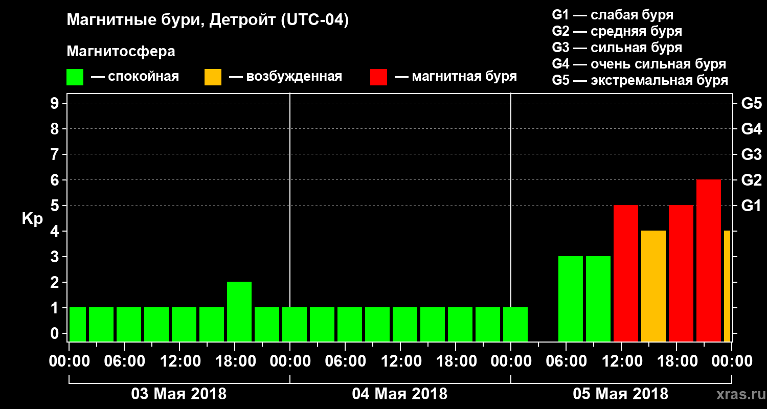 Изменения геомагнитного индекса Kp с 3 по 5 мая 2018 года для средних широт
