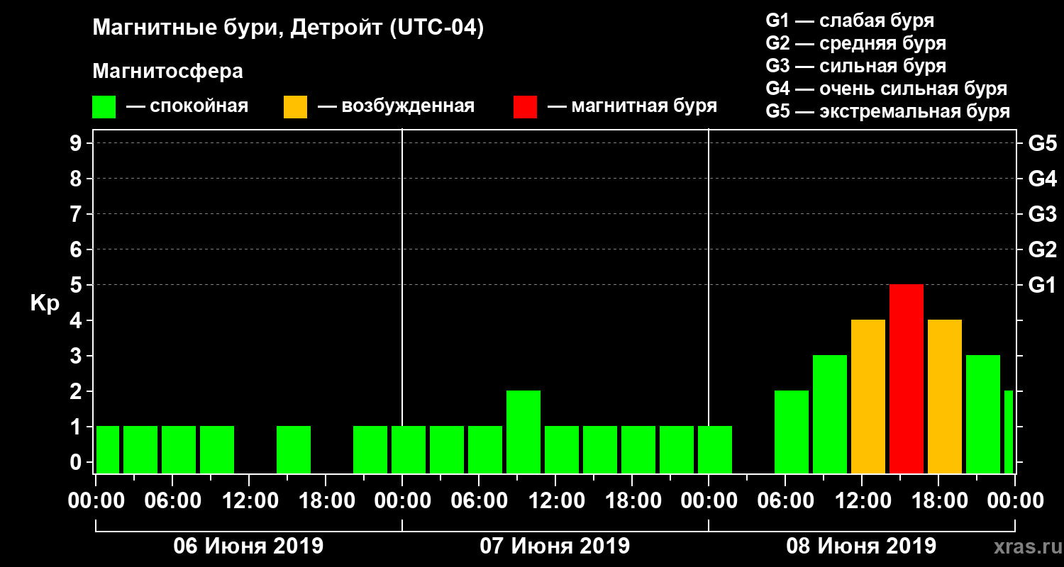 Изменения геомагнитного индекса Kp с 6 по 8 июня 2019 года для средних широт