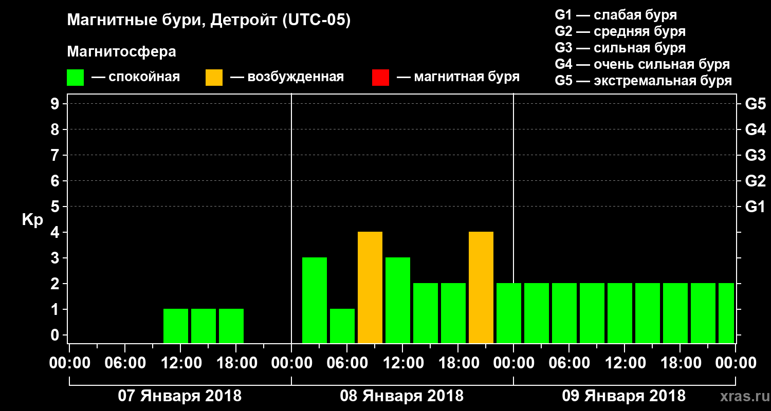 Изменения геомагнитного индекса Kp с 7 по 9 января 2018 года для средних широт