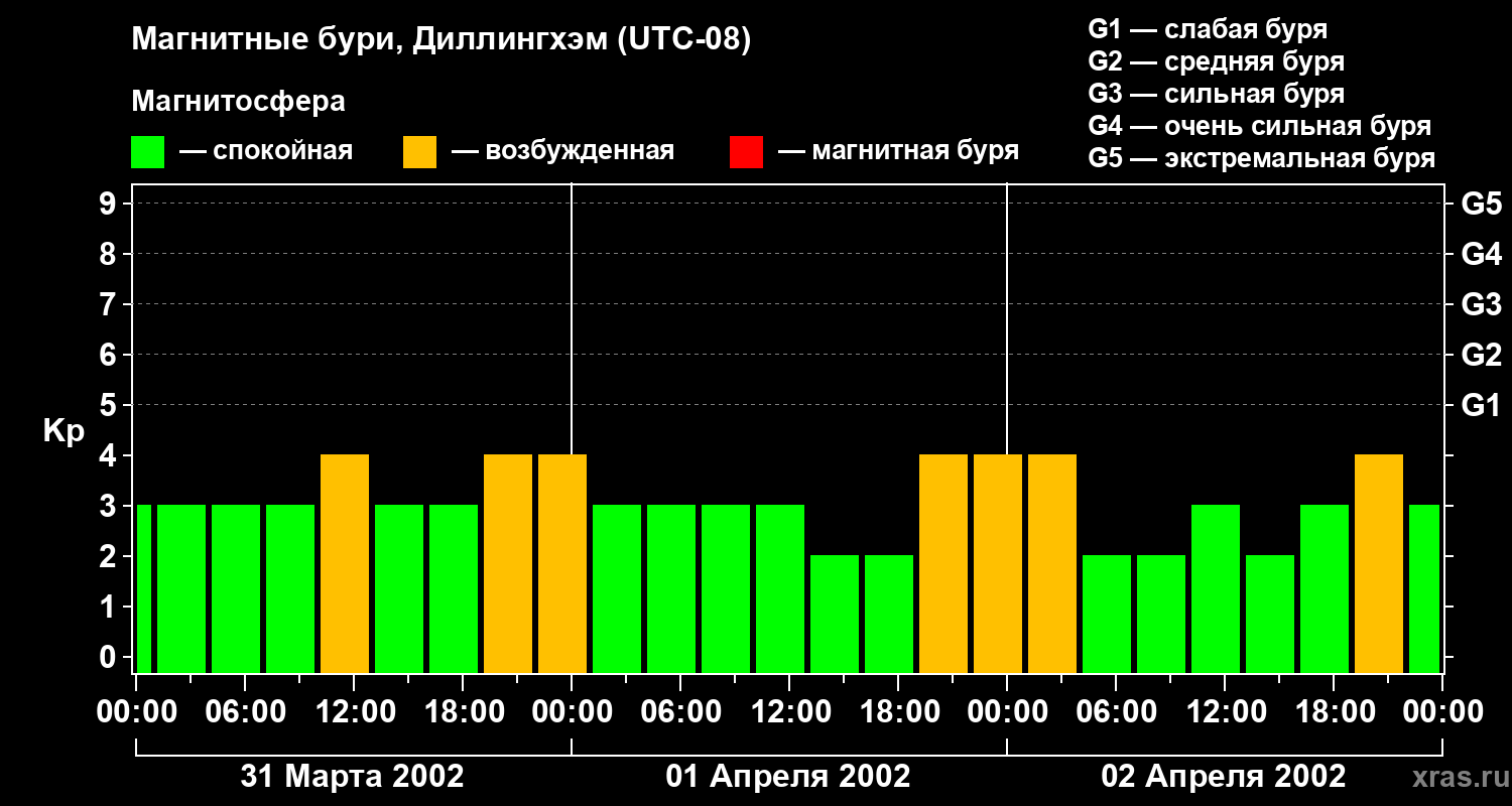 Изменения геомагнитного индекса Kp с 31 марта по 2 апреля 2002 года для средних широт