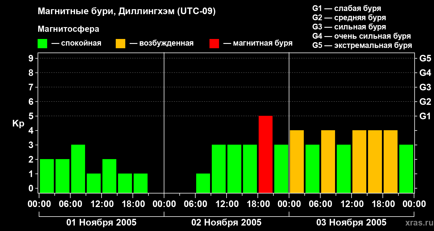Изменения геомагнитного индекса Kp с 1 по 3 ноября 2005 года для средних широт