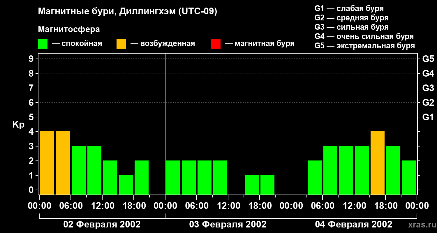 Изменения геомагнитного индекса Kp с 2 по 4 февраля 2002 года для средних широт