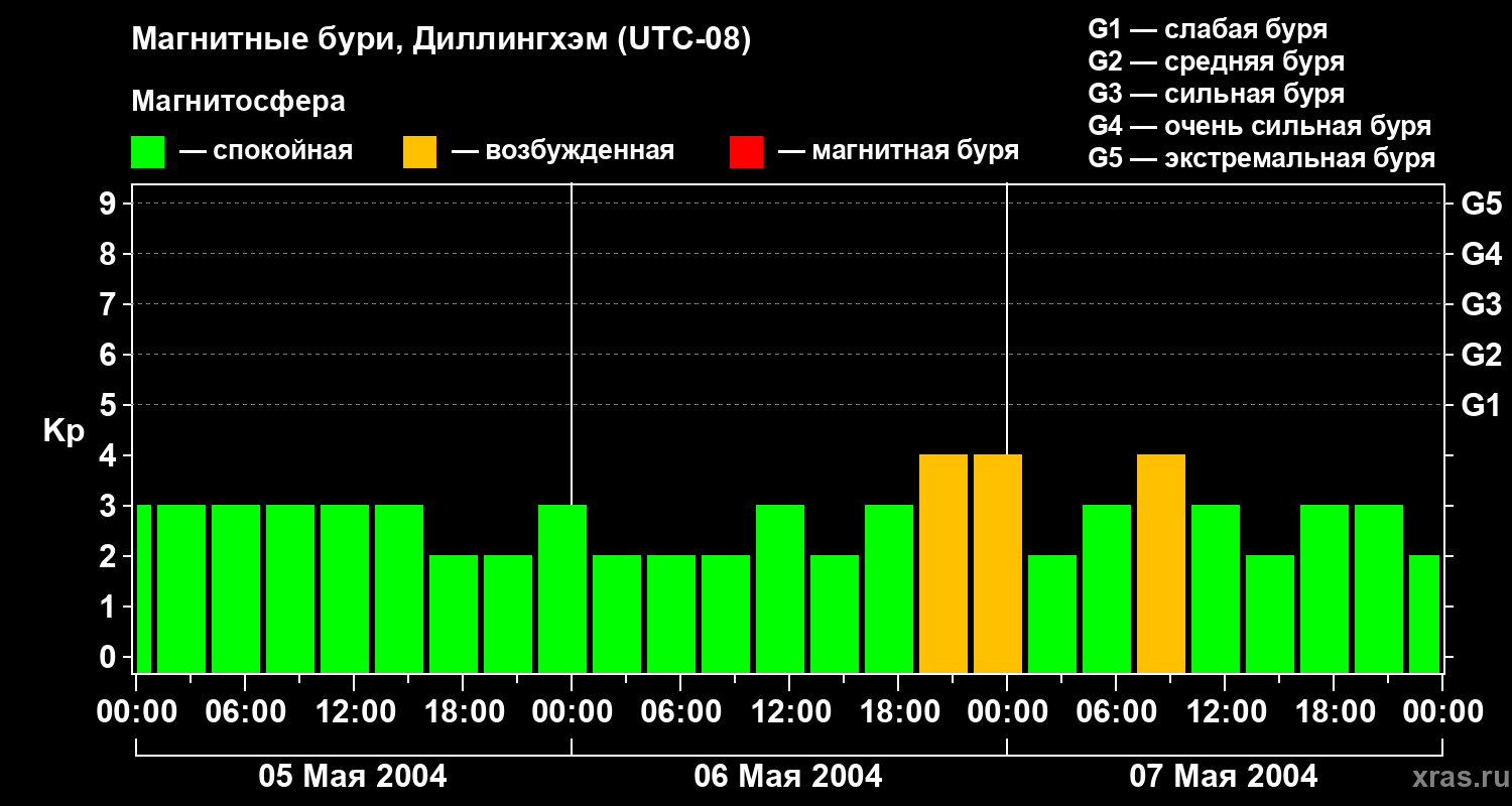 Изменения геомагнитного индекса Kp с 5 по 7 мая 2004 года для средних широт
