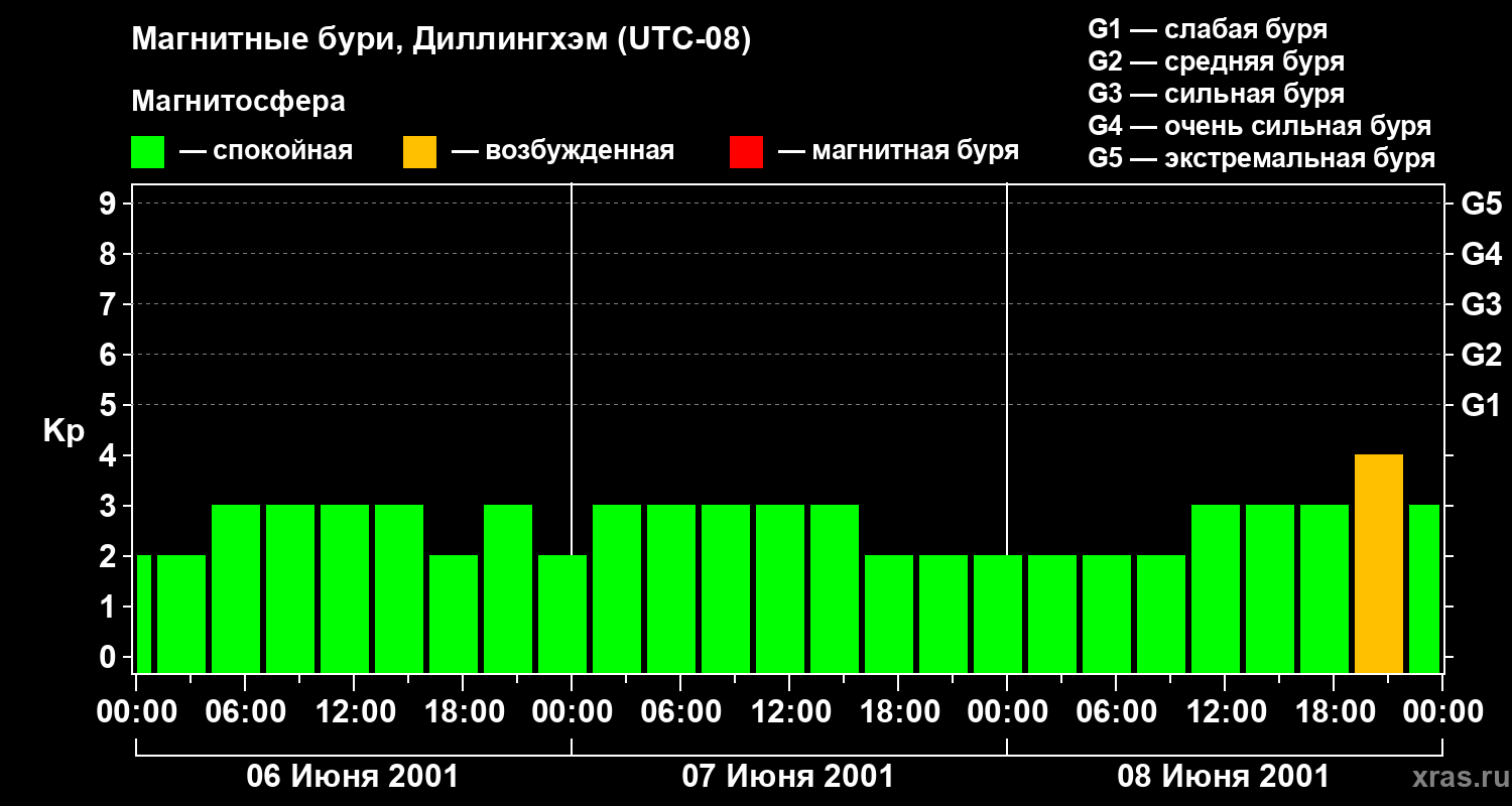 Изменения геомагнитного индекса Kp с 6 по 8 июня 2001 года для средних широт