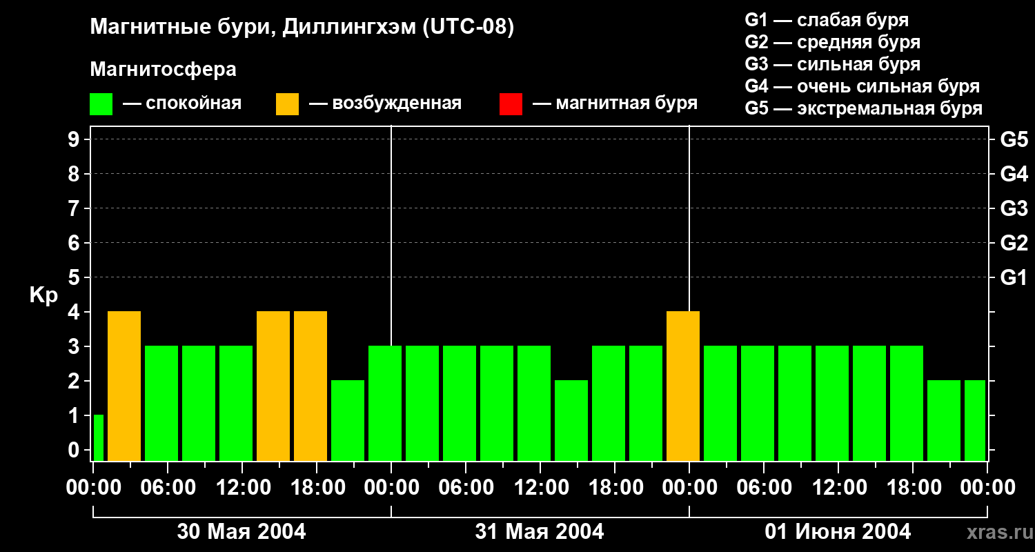 Изменения геомагнитного индекса Kp с 30 мая по 1 июня 2004 года для средних широт