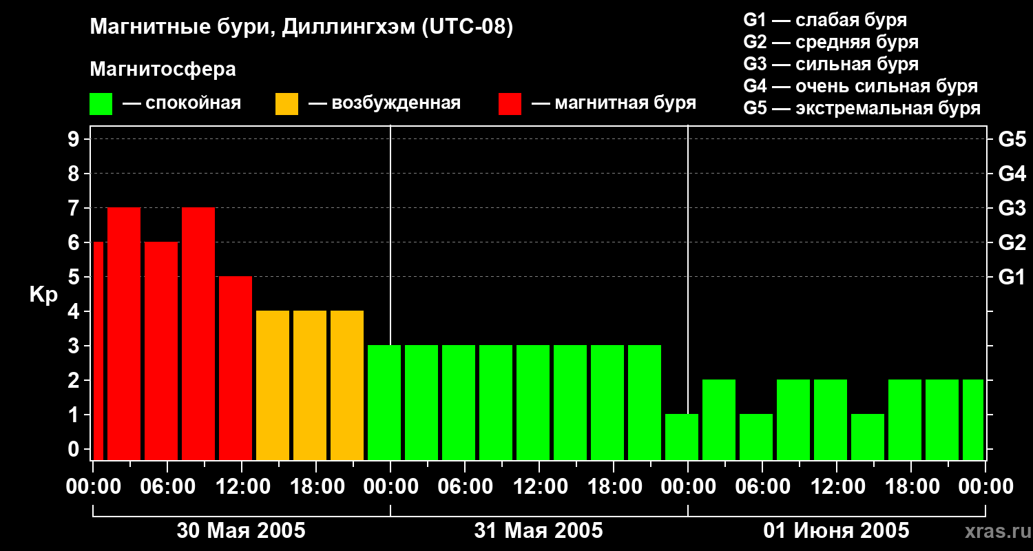 Изменения геомагнитного индекса Kp с 30 мая по 1 июня 2005 года для средних широт