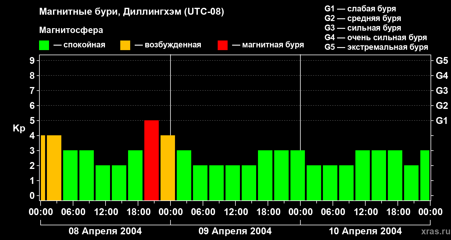 Изменения геомагнитного индекса Kp с 8 по 10 апреля 2004 года для средних широт