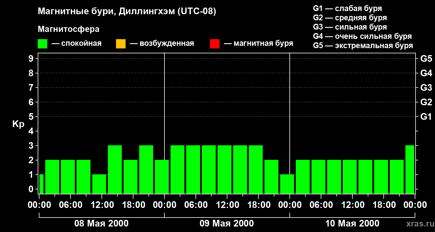 Изменения геомагнитного индекса Kp с 8 по 10 мая 2000 года для средних широт