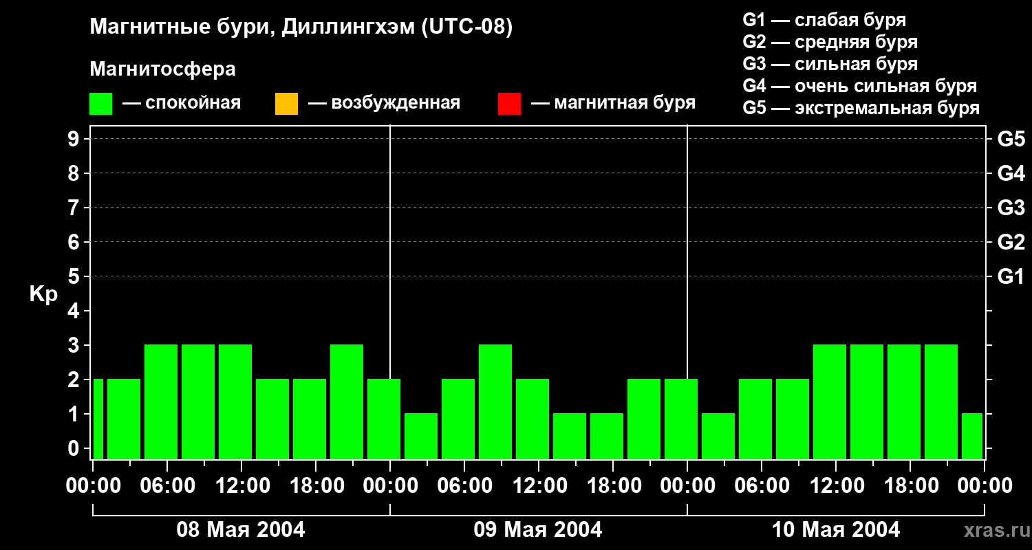 Изменения геомагнитного индекса Kp с 8 по 10 мая 2004 года для средних широт