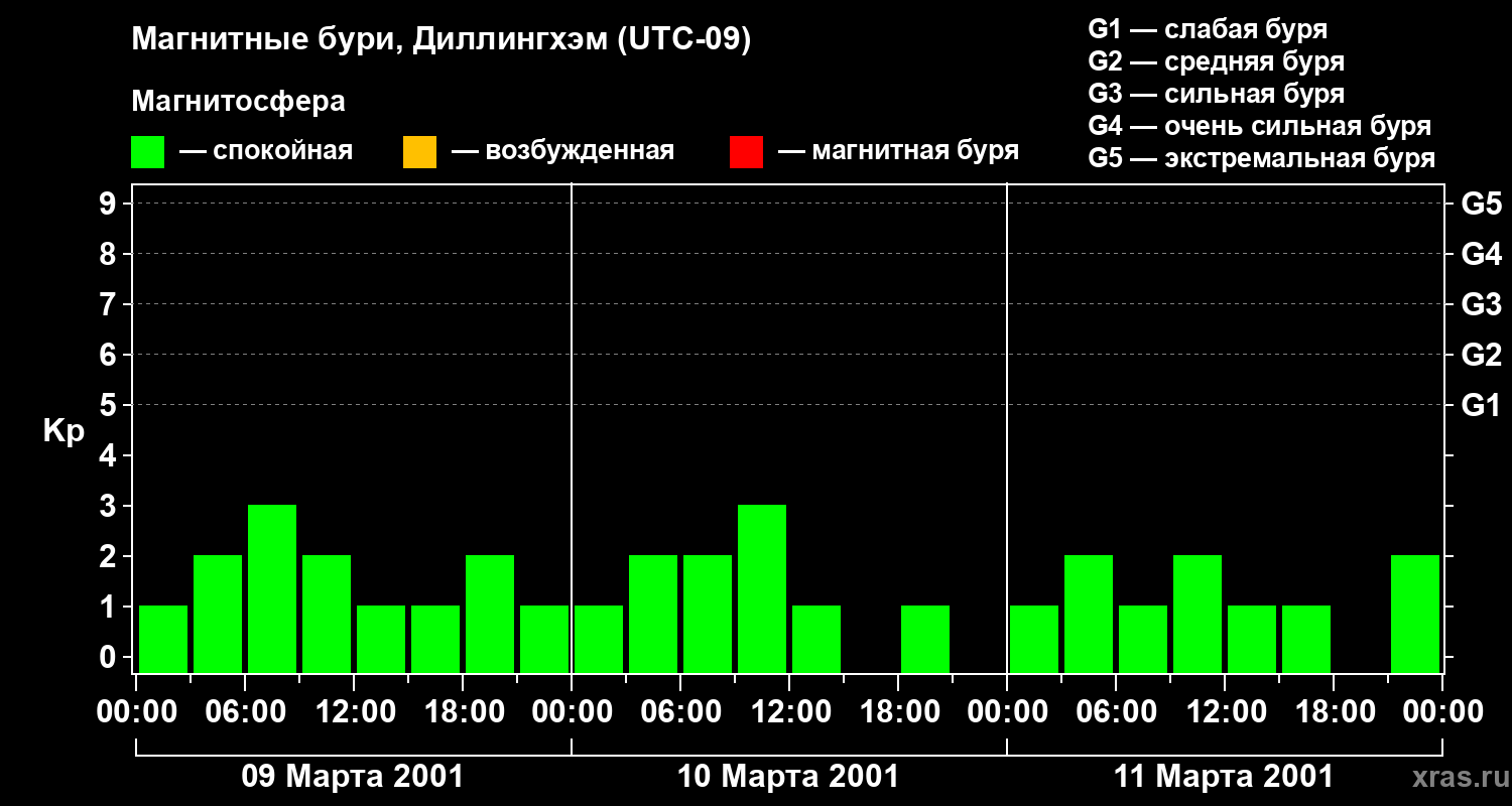 Изменения геомагнитного индекса Kp с 9 по 11 марта 2001 года для средних широт