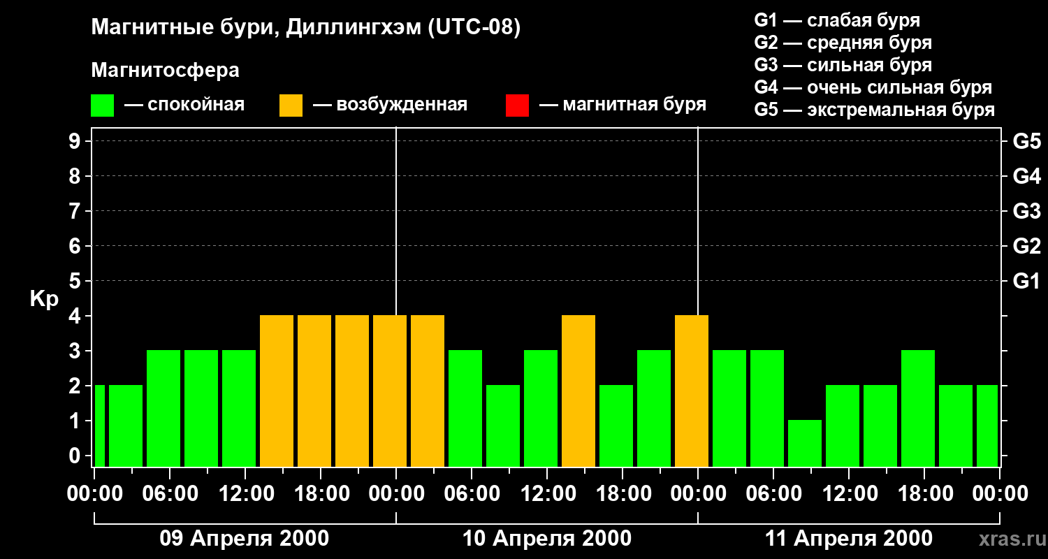 Изменения геомагнитного индекса Kp с 9 по 11 апреля 2000 года для средних широт
