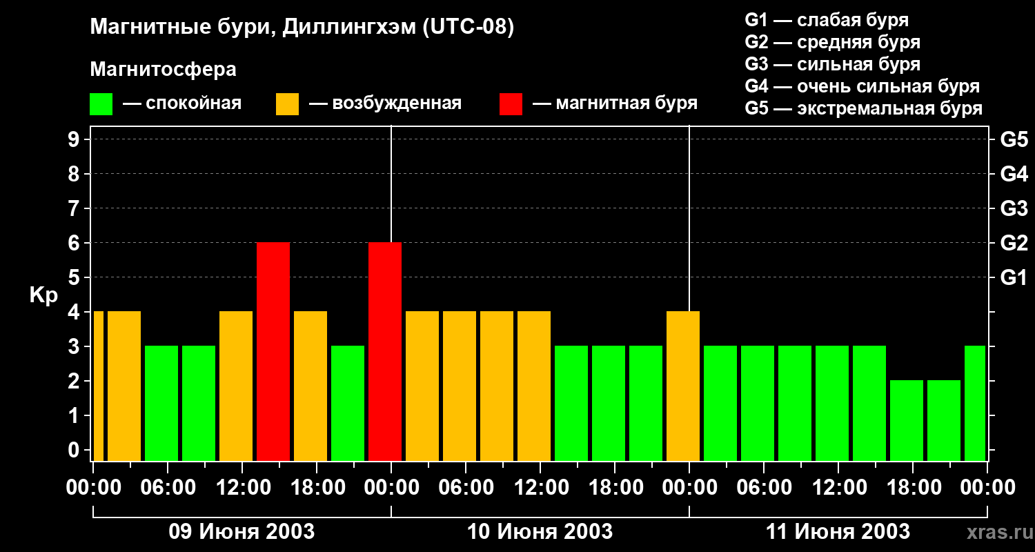 Изменения геомагнитного индекса Kp с 9 по 11 июня 2003 года для средних широт