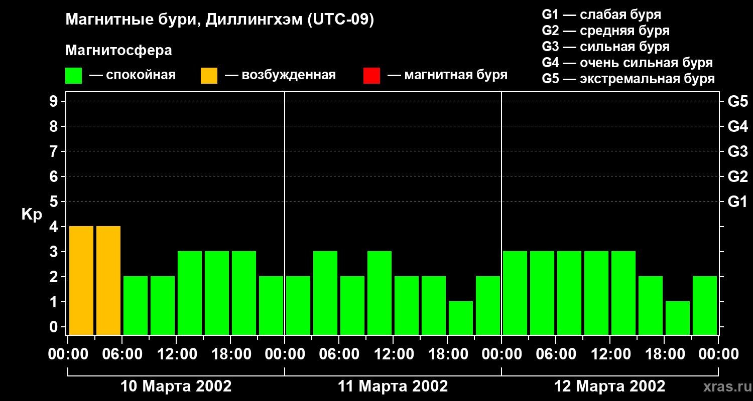 Изменения геомагнитного индекса Kp с 10 по 12 марта 2002 года для средних широт