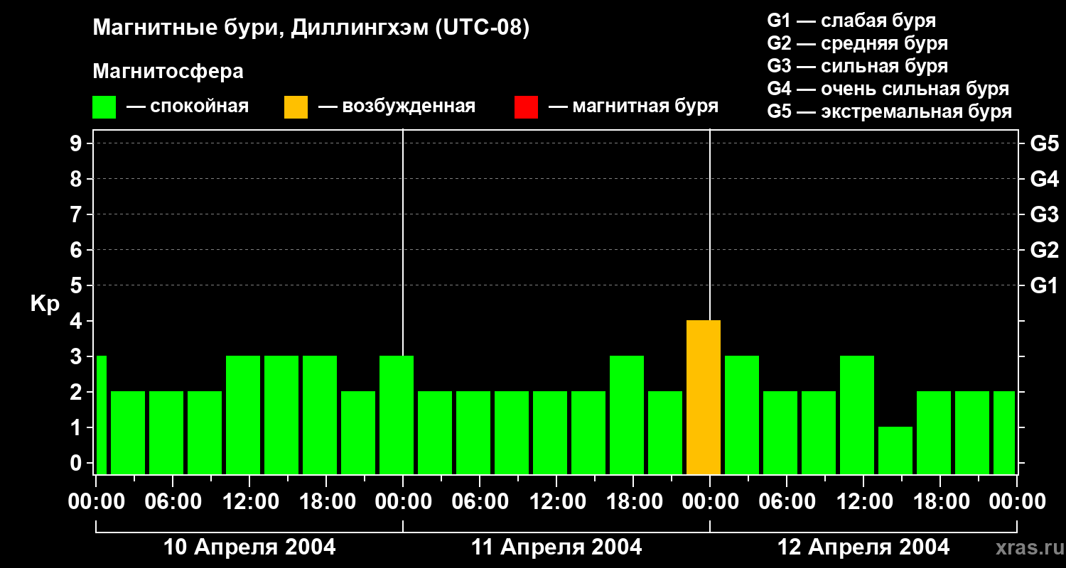 Изменения геомагнитного индекса Kp с 10 по 12 апреля 2004 года для средних широт