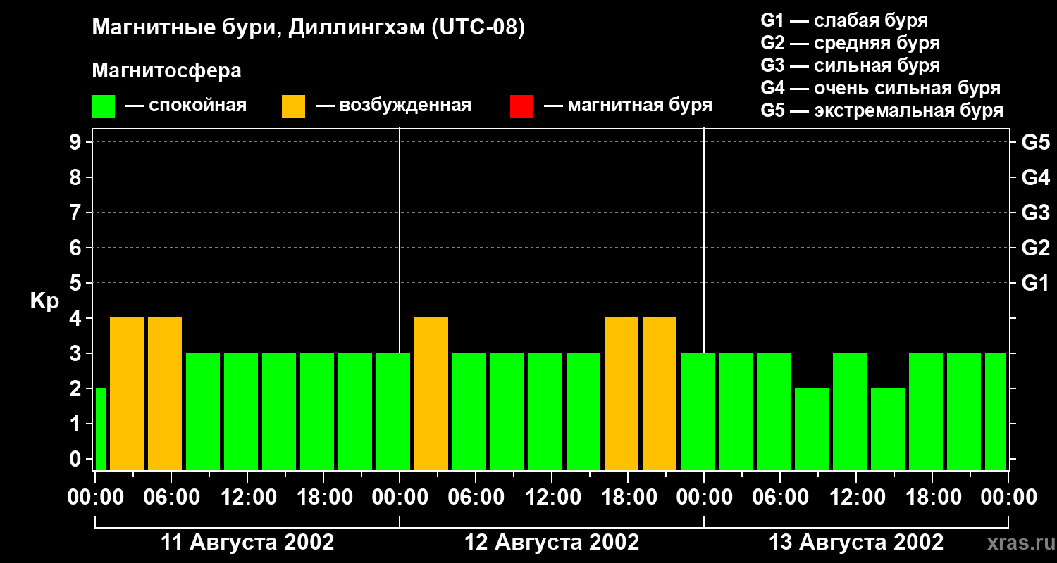 Изменения геомагнитного индекса Kp с 11 по 13 августа 2002 года для средних широт