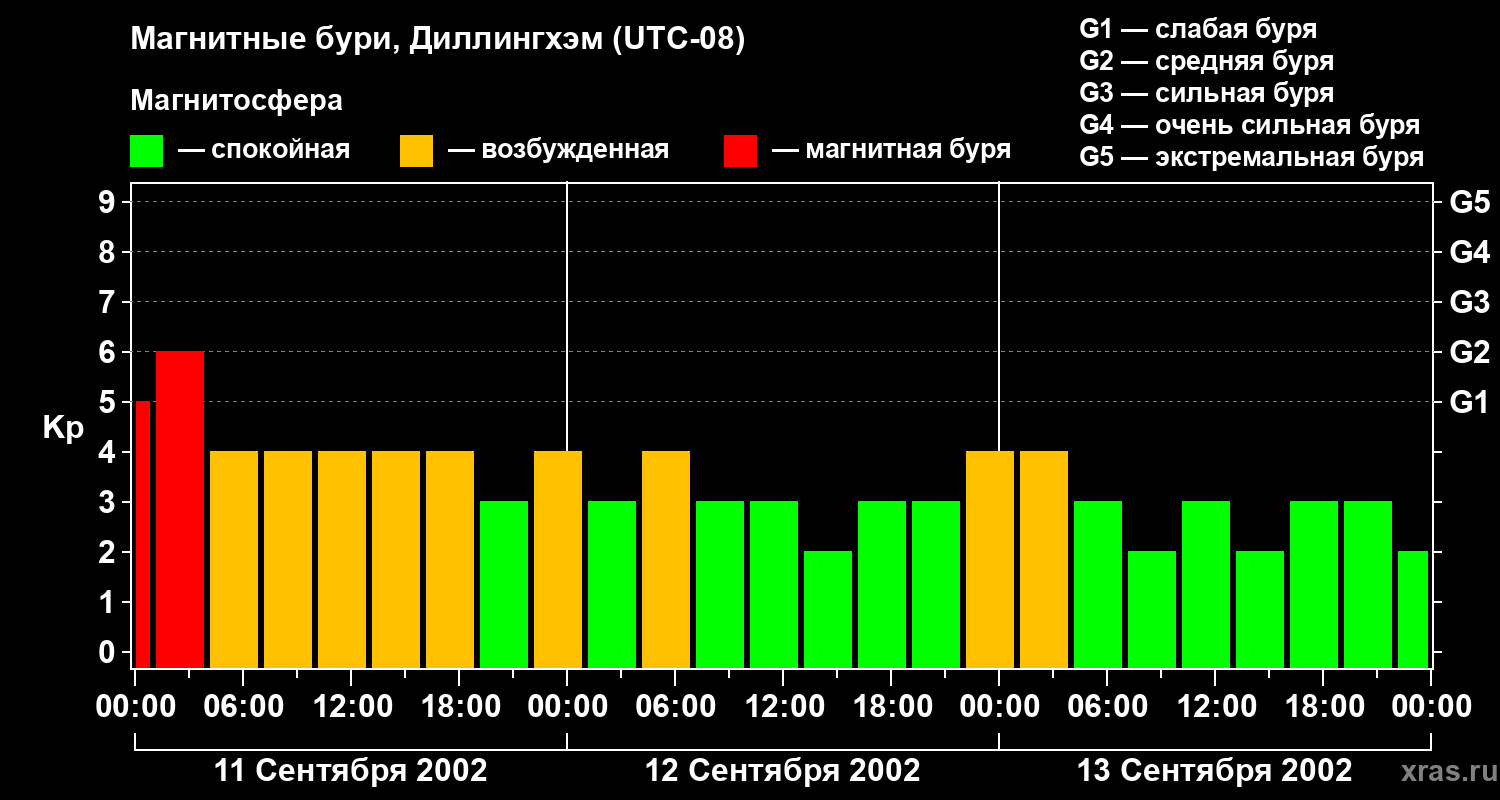 Изменения геомагнитного индекса Kp с 11 по 13 сентября 2002 года для средних широт