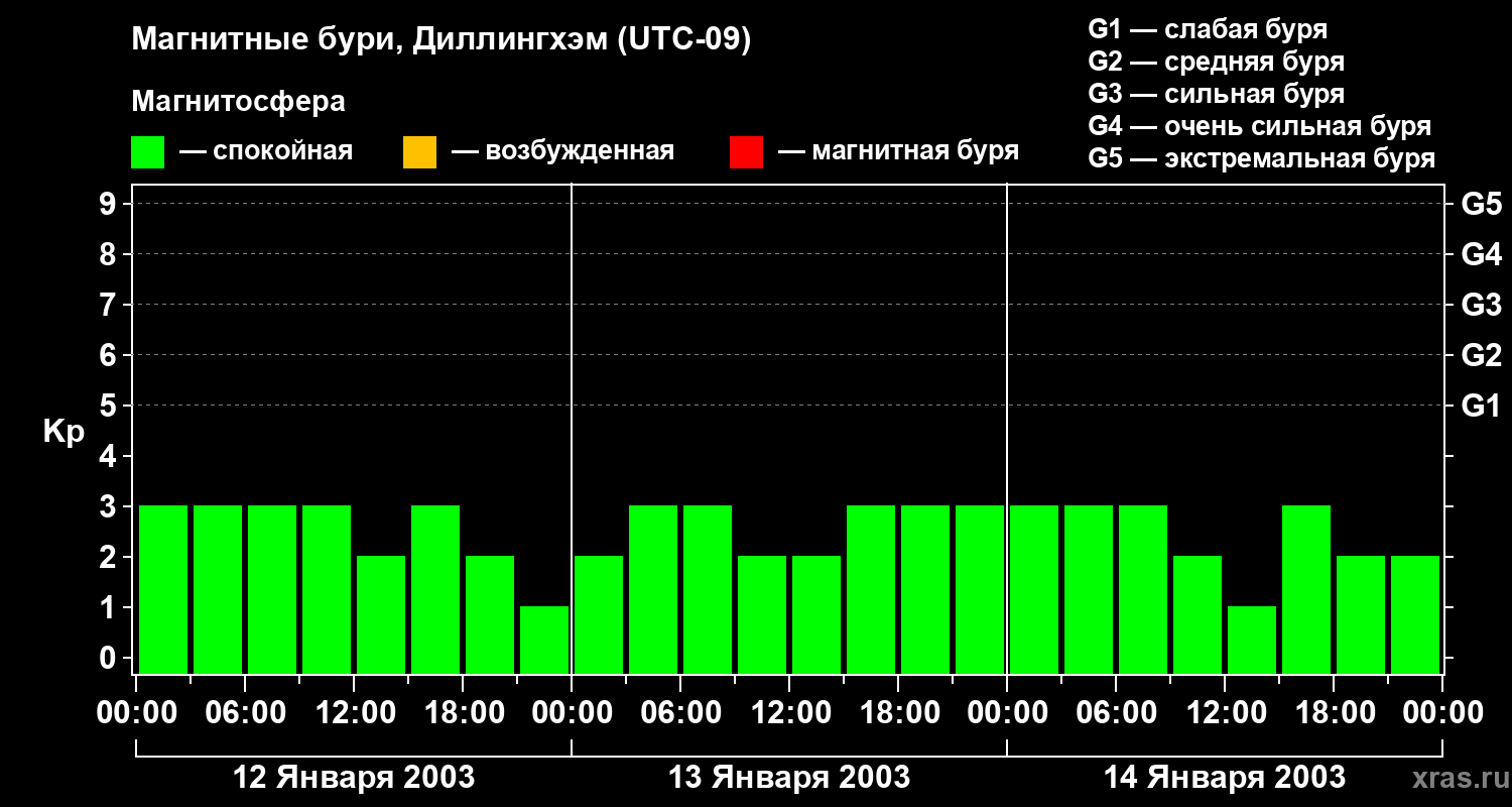 Изменения геомагнитного индекса Kp с 12 по 14 января 2003 года для средних широт