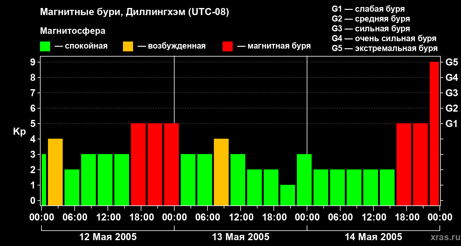 Изменения геомагнитного индекса Kp с 12 по 14 мая 2005 года для средних широт