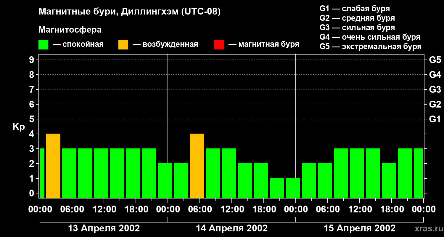 Изменения геомагнитного индекса Kp с 13 по 15 апреля 2002 года для средних широт