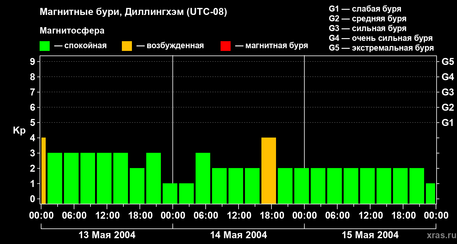 Изменения геомагнитного индекса Kp с 13 по 15 мая 2004 года для средних широт