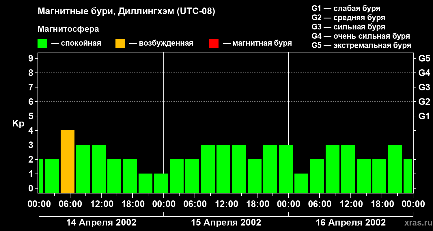 Изменения геомагнитного индекса Kp с 14 по 16 апреля 2002 года для средних широт