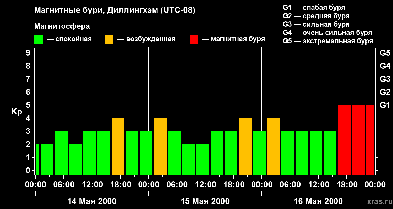 Изменения геомагнитного индекса Kp с 14 по 16 мая 2000 года для средних широт