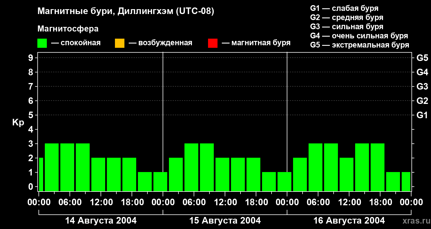 Изменения геомагнитного индекса Kp с 14 по 16 августа 2004 года для средних широт