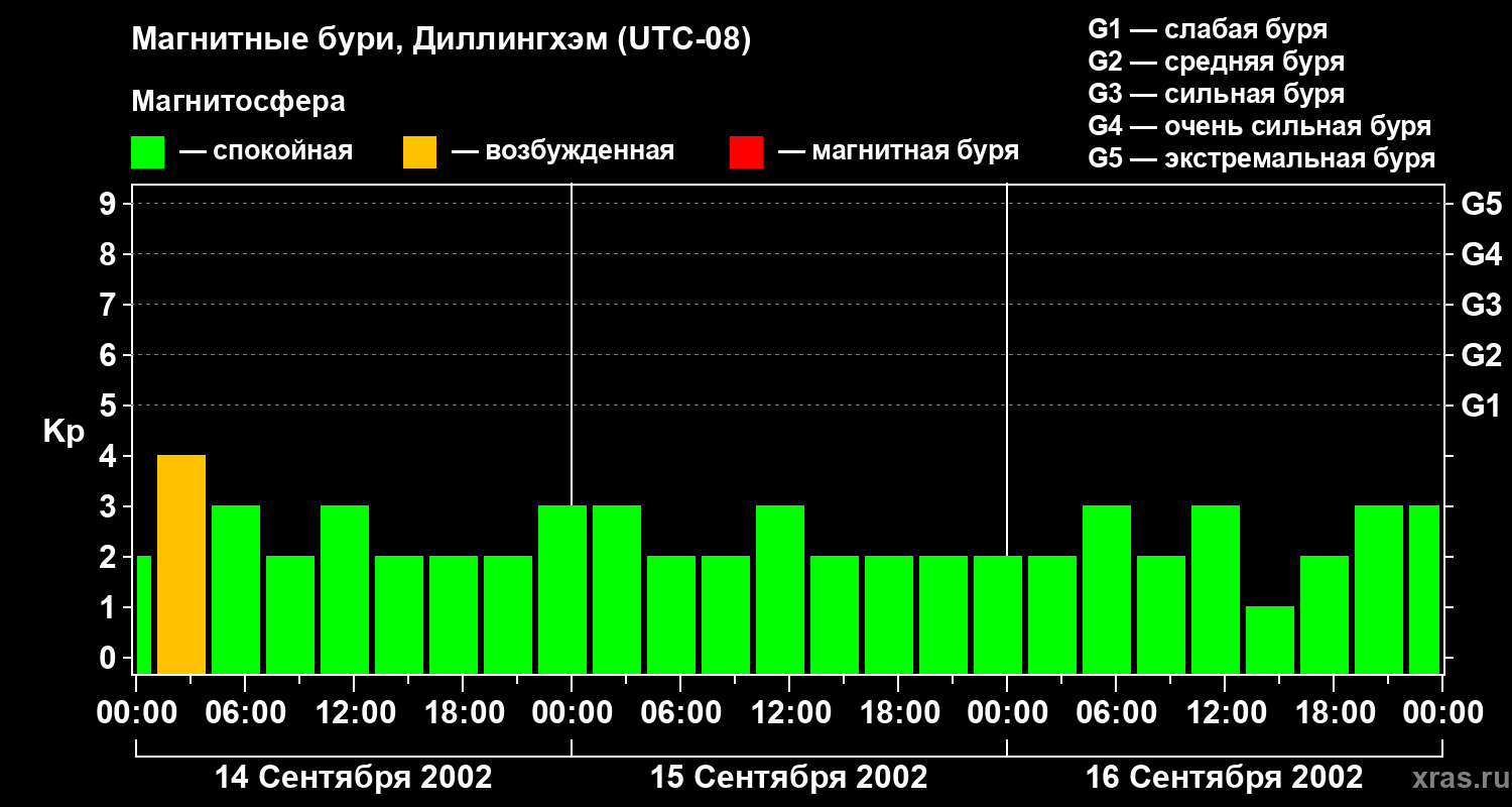 Изменения геомагнитного индекса Kp с 14 по 16 сентября 2002 года для средних широт