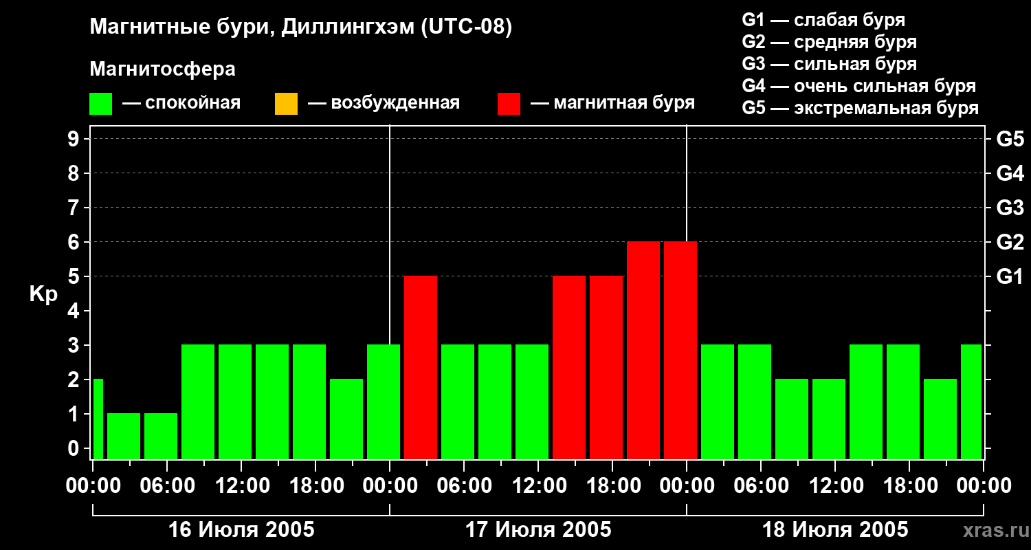 Изменения геомагнитного индекса Kp с 16 по 18 июля 2005 года для средних широт