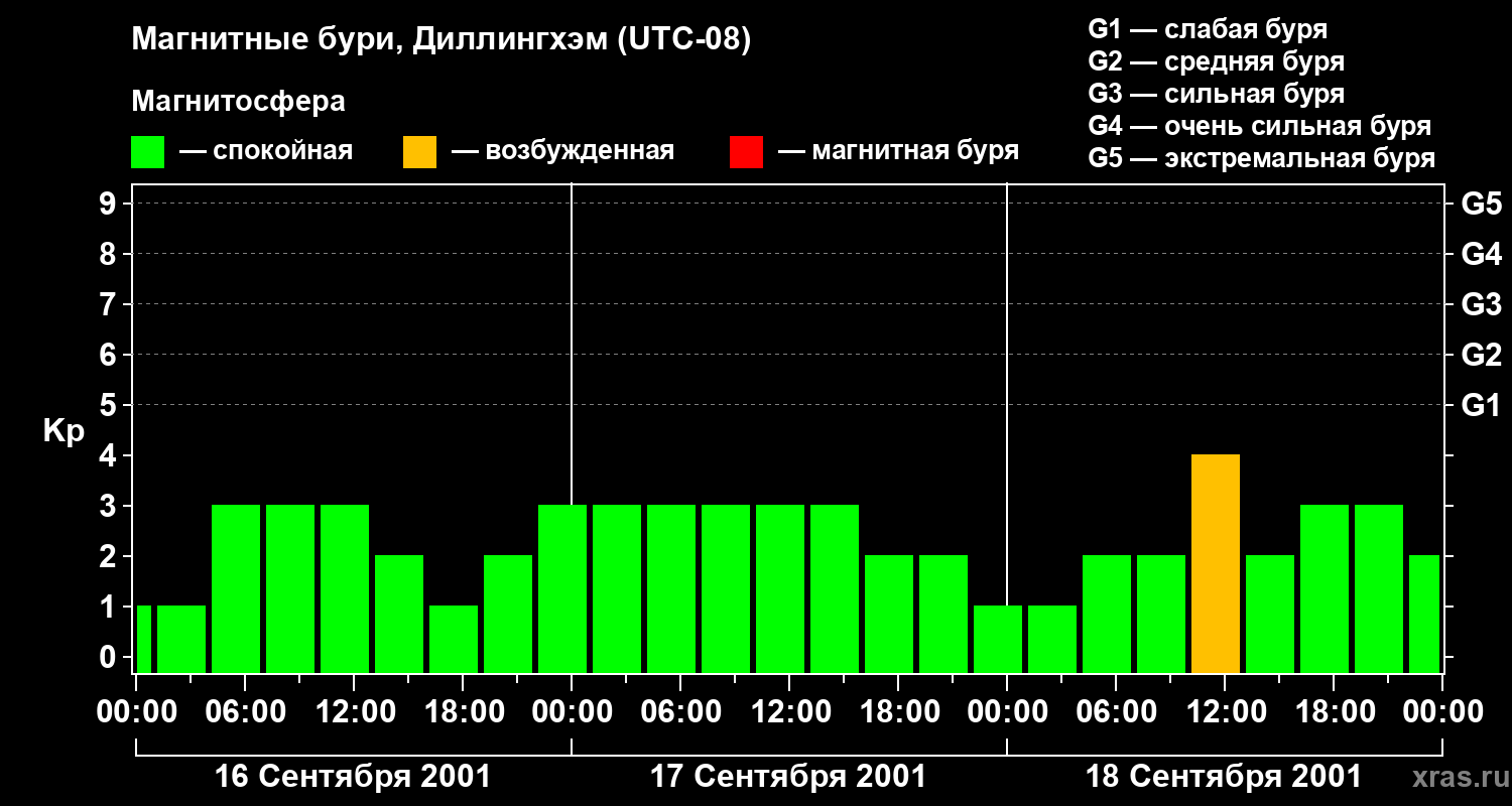 Изменения геомагнитного индекса Kp с 16 по 18 сентября 2001 года для средних широт