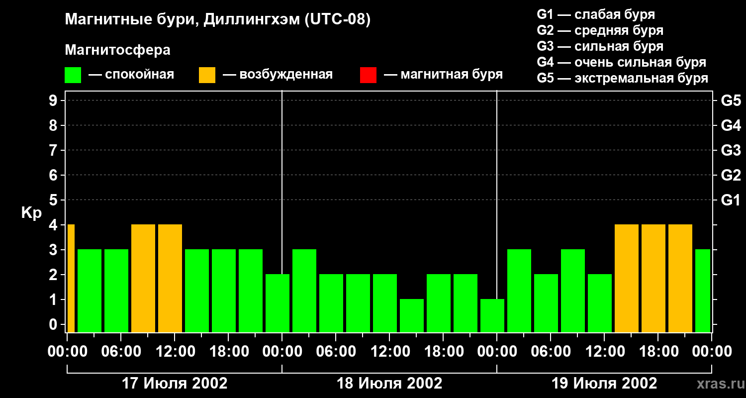 Изменения геомагнитного индекса Kp с 17 по 19 июля 2002 года для средних широт