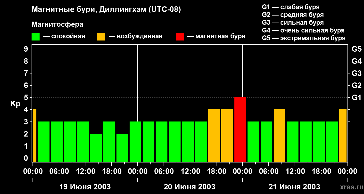 Изменения геомагнитного индекса Kp с 19 по 21 июня 2003 года для средних широт