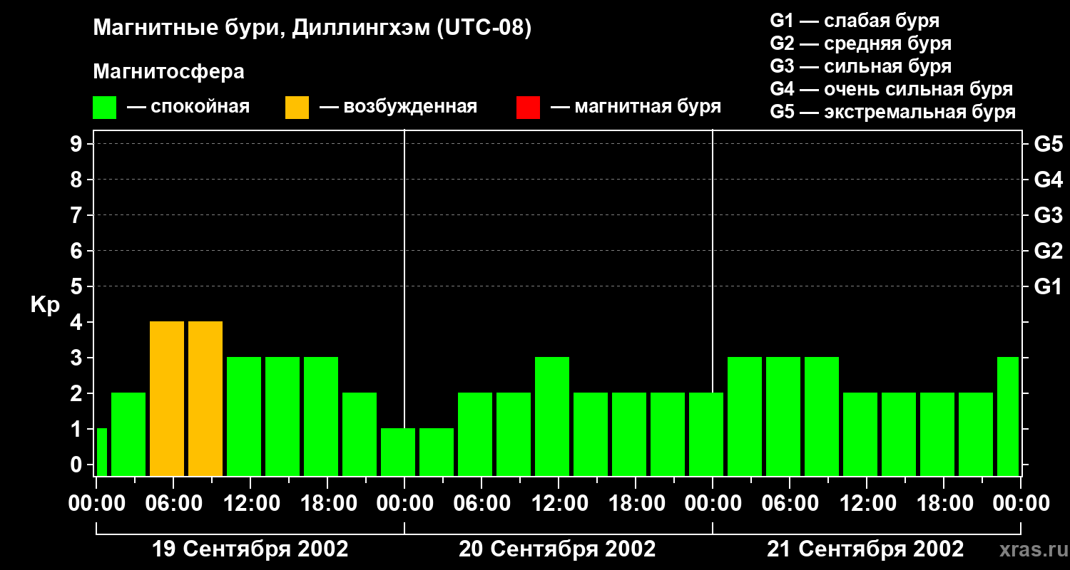 Изменения геомагнитного индекса Kp с 19 по 21 сентября 2002 года для средних широт