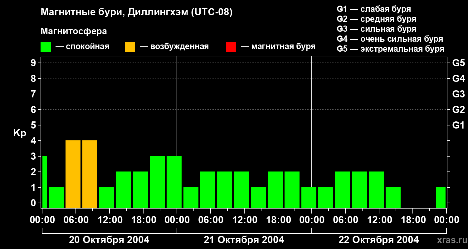 Изменения геомагнитного индекса Kp с 20 по 22 октября 2004 года для средних широт