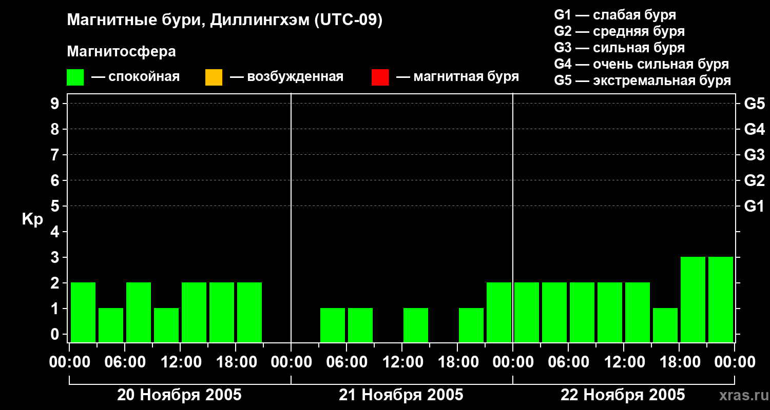 Изменения геомагнитного индекса Kp с 20 по 22 ноября 2005 года для средних широт