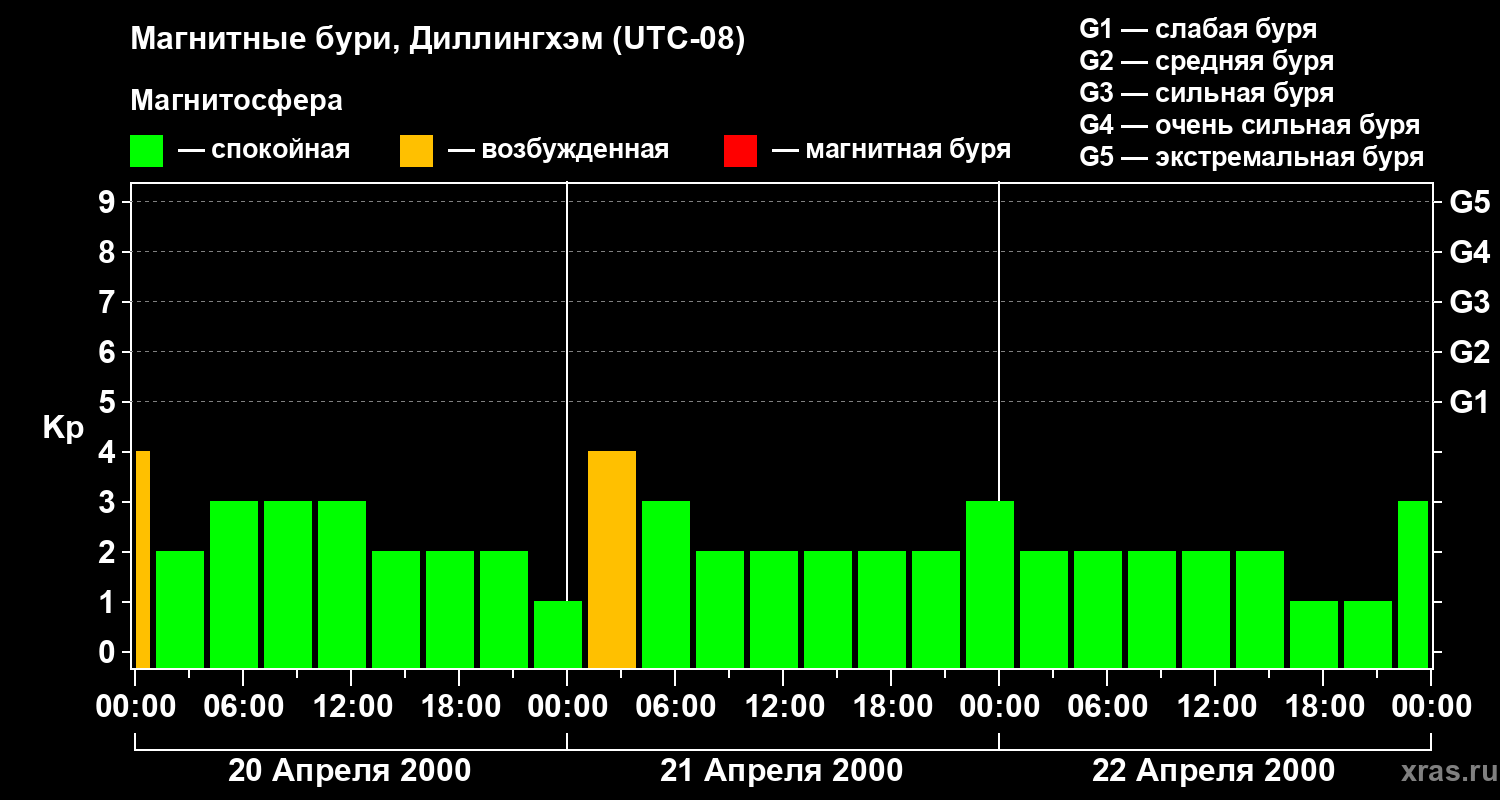 Изменения геомагнитного индекса Kp с 20 по 22 апреля 2000 года для средних широт
