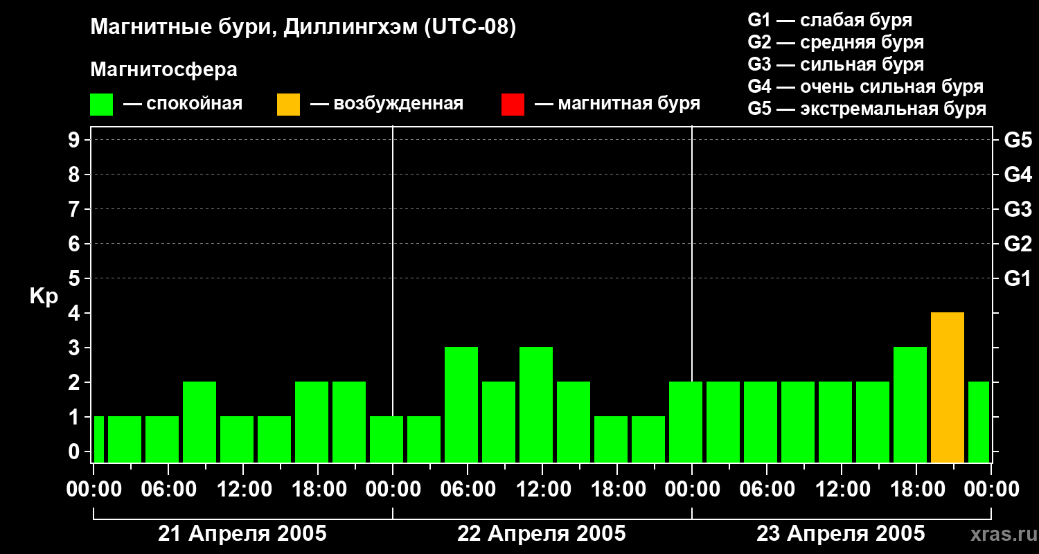 Изменения геомагнитного индекса Kp с 21 по 23 апреля 2005 года для средних широт