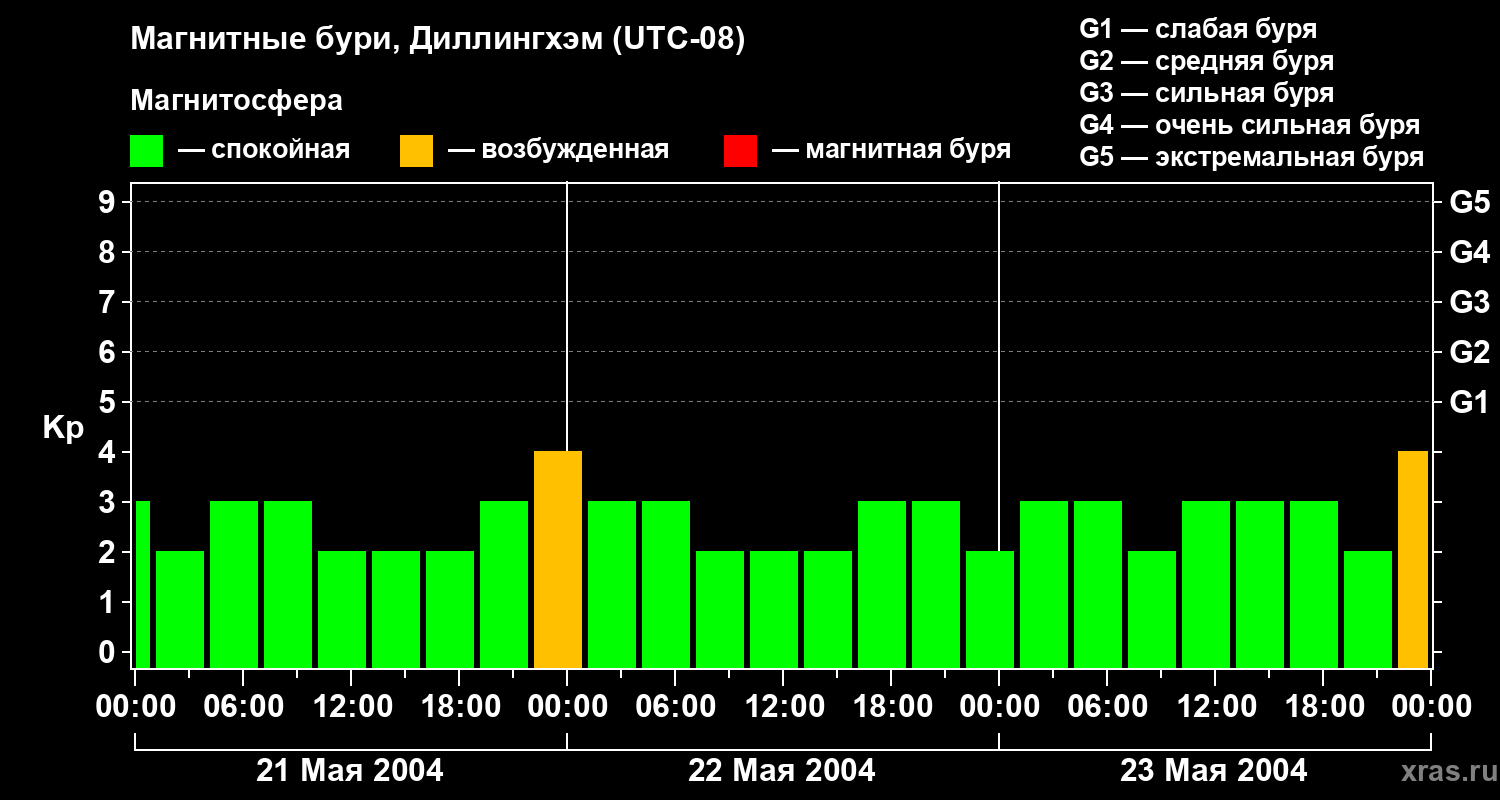 Изменения геомагнитного индекса Kp с 21 по 23 мая 2004 года для средних широт