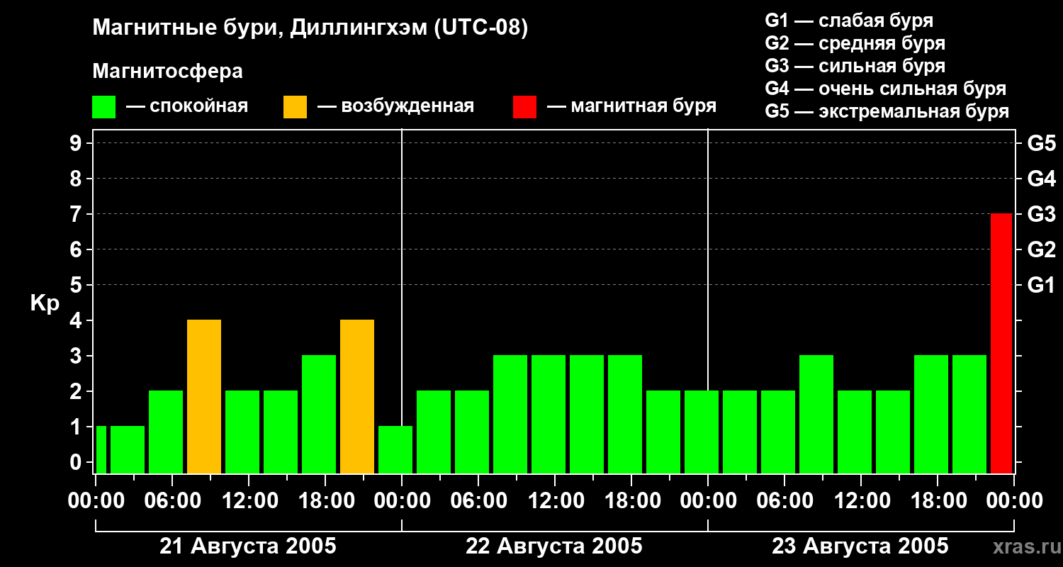 Изменения геомагнитного индекса Kp с 21 по 23 августа 2005 года для средних широт