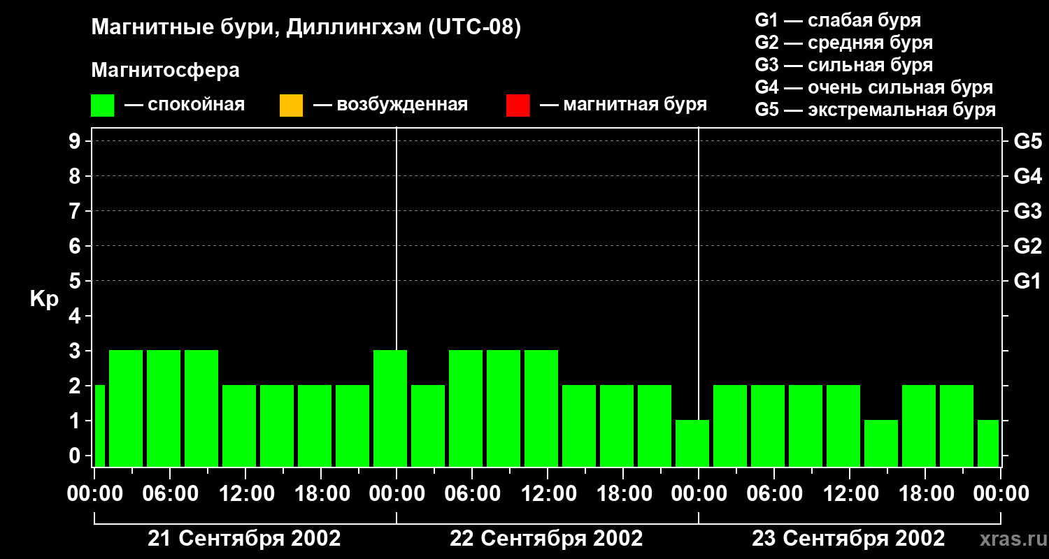 Изменения геомагнитного индекса Kp с 21 по 23 сентября 2002 года для средних широт