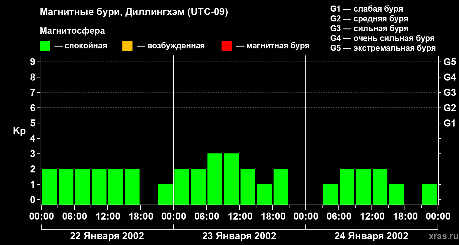 Изменения геомагнитного индекса Kp с 22 по 24 января 2002 года для средних широт