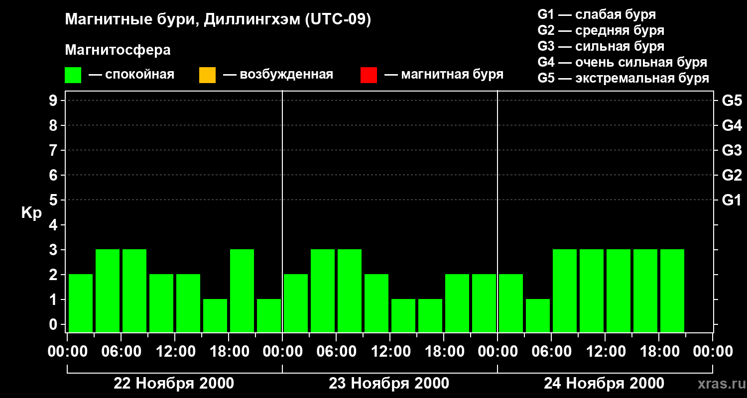 Изменения геомагнитного индекса Kp с 22 по 24 ноября 2000 года для средних широт