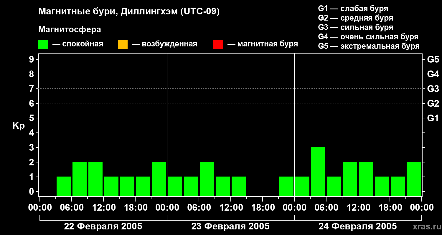 Изменения геомагнитного индекса Kp с 22 по 24 февраля 2005 года для средних широт