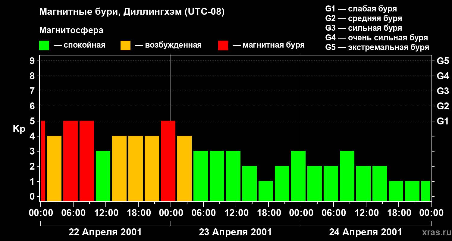 Изменения геомагнитного индекса Kp с 22 по 24 апреля 2001 года для средних широт