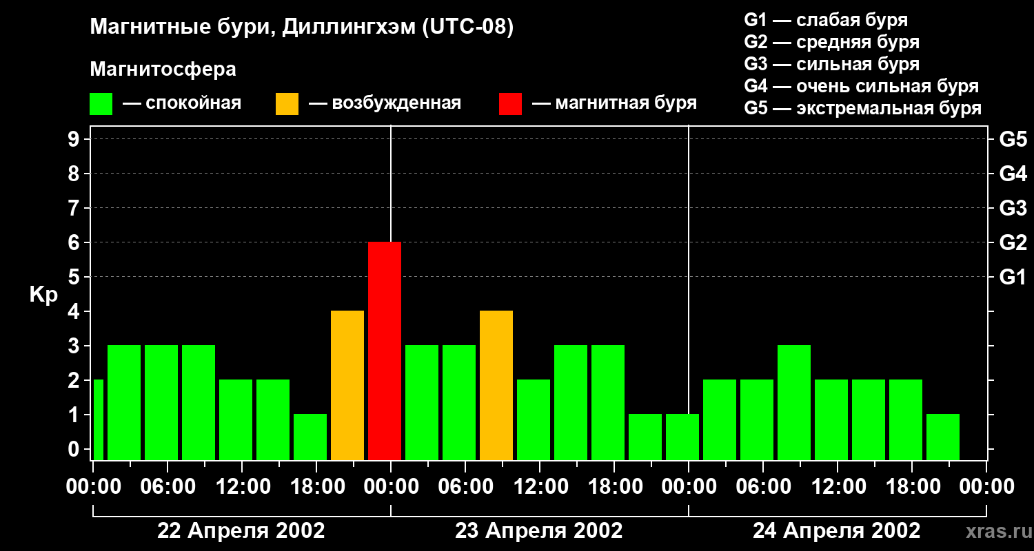 Изменения геомагнитного индекса Kp с 22 по 24 апреля 2002 года для средних широт